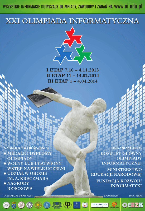 Oto oficjalny plakat XXI Olimpiady Informatycznej. Prosimy szkoły o wywieszenie tego plakatu (wersja PDF).