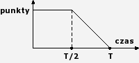 Tylko w pierwszym przypadku (tzn. udzielenie prawidłowej odpowiedzi w wyznaczonym czasie) test jest zaliczany, we wszystkich pozostałych przypadkach rozwiązanie otrzymuje 0 punktów za test. Dokładna liczba punktów za test zależy od czasu wykonania. Jeśli maksymalny dopuszczalny czas wynosiłT, a program zakończył się w czasie krótszym niż T/2, to otrzymuje maksymalną możliwą liczbę punktów; w przedziale T/2...T uzyskane punkty liniowo maleją, tak by osiągnąć 0 przy czasieT. Zależność ta pokazana jest na rys. 1.