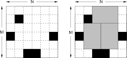 1<=y<=M) - coordinates of one bad square (the upper left square has