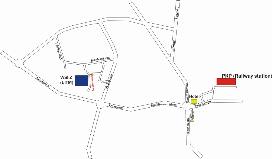 Travel:By airJasionka is a small local airport. It's connected with Kraków, Warszawa and other cities but not on a regular basis. Please check details with the following companies: PLL LOT +48 17 862-03-47 White Eagle Aviation +48 22 650-10-30 (31-33) e-mail: office@whiteeagle.com.pl 4-Air Airlines +48 17 771-20-20 mobile 602 373 656 4-air@wist.com.pl After arriving at Jasionka, organizers will take you to the competition site. By trainAll trains arrive at Rzeszów railway station located in the center of the city. The official train timetable can be obtained from PKP website. After arriving to Rzeszów by the train, organizers will take you to the competition site. Around the cityHere is some information according communication around Rzeszów: Airport -> WSIiZYou can take bus #14 or call a taxi (phones: 9626 or 919). If you choose a bus, you sould get out at the last bus stop (it is near railway station on the map). Then the route is the same as from the railway station. Railway station -> WSIiZTo get to WSIiZ take bus #17 or #19 from Pi³sudskiego Street and get off at the 2nd bus stop. You will be between Wiadukt ¦l±ski Viaduct and roundabout (Krakowska and Okulickiego Streets). Next, go across Okulickiego Street, then turn right and walk along the street approximately 200 meters until you see a block of flats (opposite to shopping mall). Afterwards, take a narrow street on your left (between flats, you are about 400 meters from the University). Walk to the end of the street, then turn right and after another 50 meters you are on site. You can also walk from the railway station by feet, it takes approx. 30 minutes. Bus station -> WSIiZThe route from the bus station is the same as from railway station - those two stations are neighbouring. | |||||||||||||||||||||||||||||||||||||||||||||||||||||||||||||||||||||