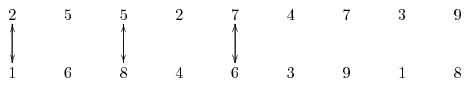 InputIn the first line of the input there is one integer n, 1 <= n <= 50 000. In each of the two rows there are n soldiers standing. In each of the following two lines there are n positive integers separated by single spaces. In the second line there are numbers x1, x2,..., xn, 1 <= xi <= 100 000; xi denotes the height of the ith soldier in the first line. In the thrid line there are numbers y1, y2,..., yn, 1 <= y <= i100 000; yi denotes the height of the ith soldier in the second line.It is guaranteed that in the instances from the test data it is possible to set up soldiers properly.