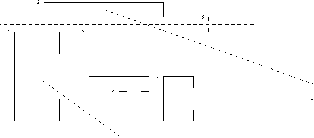 The picture shows the temples described in the file OLT.IN. The dashed lines show possible routes of evil spirits.