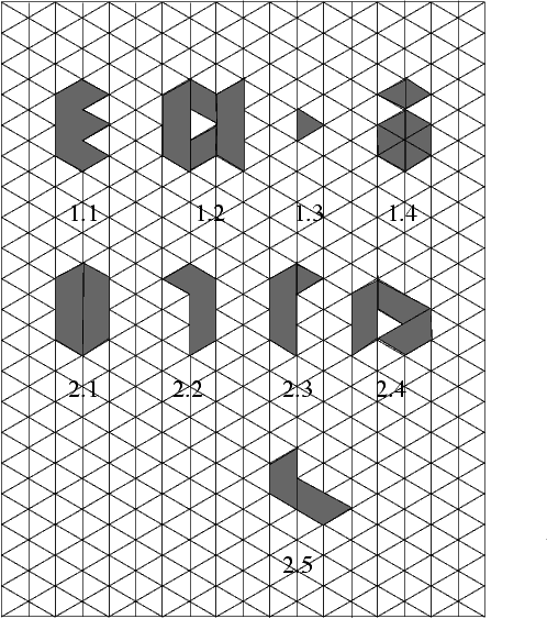 A path in a lattice of triangles is a name for any finite sequence of triangles (of side 1) of the lattice, such that every two consecutive triangles in the sequence have a common side. A figure made of points of a finite number of lattice triangles is called an island, if any two triangles contained in it can be connected by a path composed of that figure's triangles. ExampleThe figures presented on the pictures 1.1, 1.2 and 1.3 are islands. The figure on the picture 1.4 is not an island. Figures on the pictures 2.2, 2.3 and 2.5 are congruent. For every n <= 10 we intend to describe systematically all non-congruent islands which may be made of n triangles of side 1, and to count them. A coast of every island built of at most 10 triangles is a closed broken line, consisting of unitary segments, and it may be circulated (contoured round without taking the pencil off the paper) in such a way that we run along every segment of the coast exactly once and get back to the starting point. It may happen that it is necessary to go more than once through a particular point - cf e.g. the picture 2.4. In the case of islands built of at most 10 triangles, it is not possible to get a situation such as the one presented on the picture 1.2, i.e. the coast of that figure consists of two separate parts and it cannot be circulated.